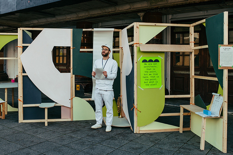 A Pavilion For U.S. is a public artwork by William Luz that is a site and stage for exhibition and exchange. A temporary structure appeared at three different sites directly on Union Street. Modelled on a traditional dressing screen or room divider it references elements of the Street’s story and the separated social encounters we currently have. Over the course of the Art Weekender through a range of activities, resources and performances the structure offered a space to discuss ideas around the theme of unity; including oneness, togetherness and political forms of coupling, and where better to begin, than Union Street.